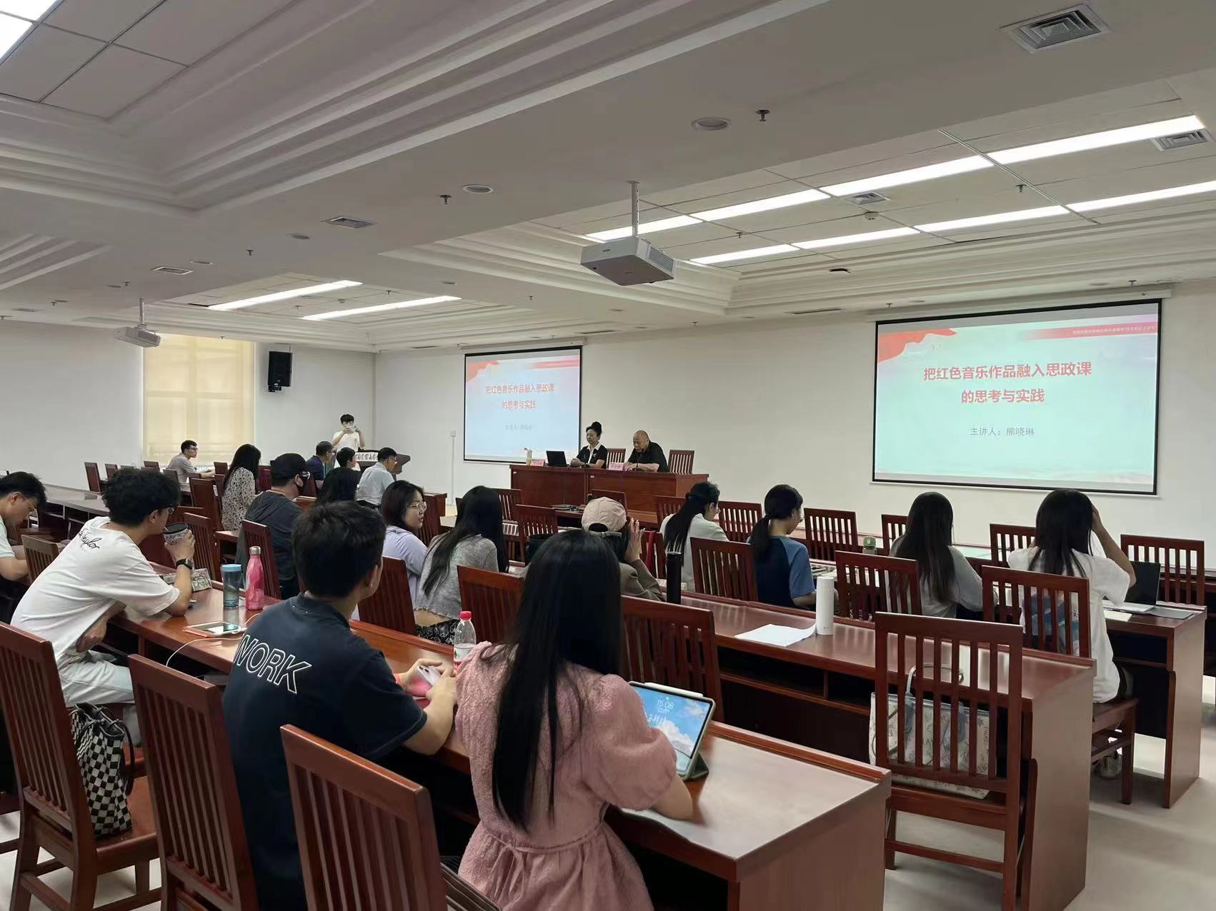 熊晓琳以《坚定理想信念,践行初心使命——红色音乐经典的奋斗百年路》为题,以《没有共产党就没有新中国》这一歌曲的创作历程为切入口,巧妙运用红色歌曲为载体引出中国共产党百年奋斗历程,并从“艰辛探索,东方曙光”、“开辟道路,星火燎原”、“雄关漫道,万水千山”、“抗日烽火,艰苦卓绝”、“人民解放,当家做主”五个阶段进行阐述。