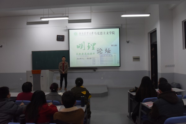 11月29日下午,青年马克思主义研究会在繁塔楼C-106教室举办第五期“明理论坛”。本次论坛以“大学生就业与求职素养提升”为主题,主讲人是马克思主义学院2015级思想政治教育专业硕士研究生张岩。青年马克思主义研究会的会员们准时到场,并聆听报告。