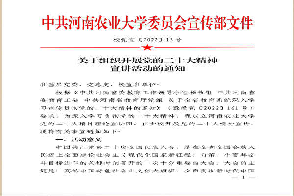 (李秋潭 刘梦迪 文,翟有为 图 )据悉,最近学校党委宣传部根据《中共河南省委教育工作领导小组秘书组 中共河南省委教育工委 中共河南省教育厅党组 关于全省教育系统深入学习宣传贯彻党的二十大精神的通知》(豫教党〔2022〕161号)要求,成立河南农业大学党的二十大精神理论宣讲团,从今年 11月至2023年3月,围绕党的二十大精神开展宣讲活动。我中心研究人员陈娱、姚锡长、秦剑军、刘宁静、郭武轲、王晨、刘歆立、孙玉健等被遴选为宣讲人。