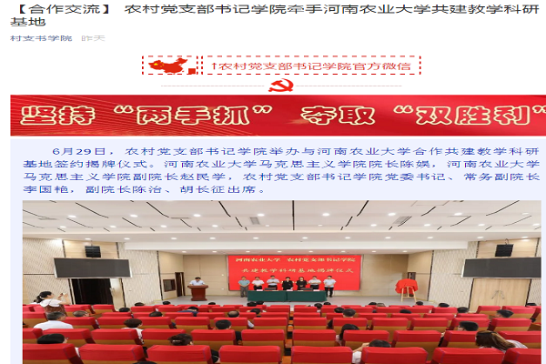 2020年6月29日上午,由我中心参与举行了河南农业大学马克思主义学院(濮阳)农村党支部书记学院教学与科研实习基地挂牌与《河南农业大学与农村党支书学院战略合作协议》签订仪式。