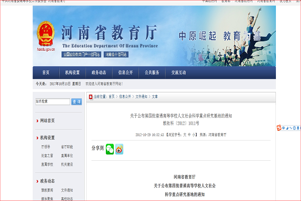 根据河南省教育厅2012年10月29日发布的《关于公布第四批普通高等学校人文社会科学重点研究基地的通知(教社科[2012]1011号)》,我中心正式被却认为河南省普通高等学校人文社会科学重点研究基地培育基地。
