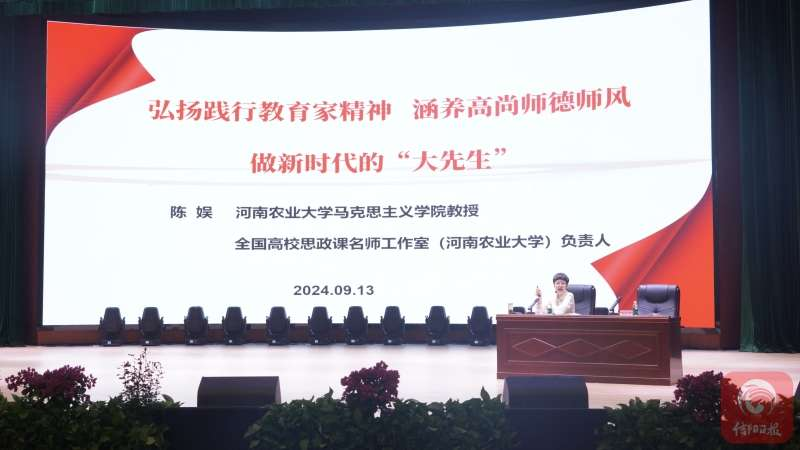 (通讯员:朱晗菲)为贯彻落实《中共中央 国务院关于弘扬教育家精神加强新时代高素质专业化教师队伍建设的意见》精神,9月13日,信阳艺术职业学院开展师德师风专题讲座,邀请我院教授陈娱作了题为《弘扬践行教育家精神 涵养高尚师德师风 做新时代的“大先生”》的报告。师生代表共百余人聆听报告。