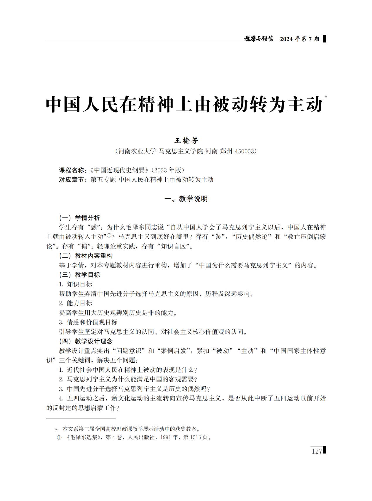 《教学与研究》(CSSCI来源期刊)“第三届全国高校思想政治理论课教学展示”栏目刊发我院教师王榆芳获奖教案《中国人民在精神上由被动转为主动》。在第三届全国高校思想政治理论课教学展示活动中王榆芳荣获中国近现代史纲要课程全国二等奖。