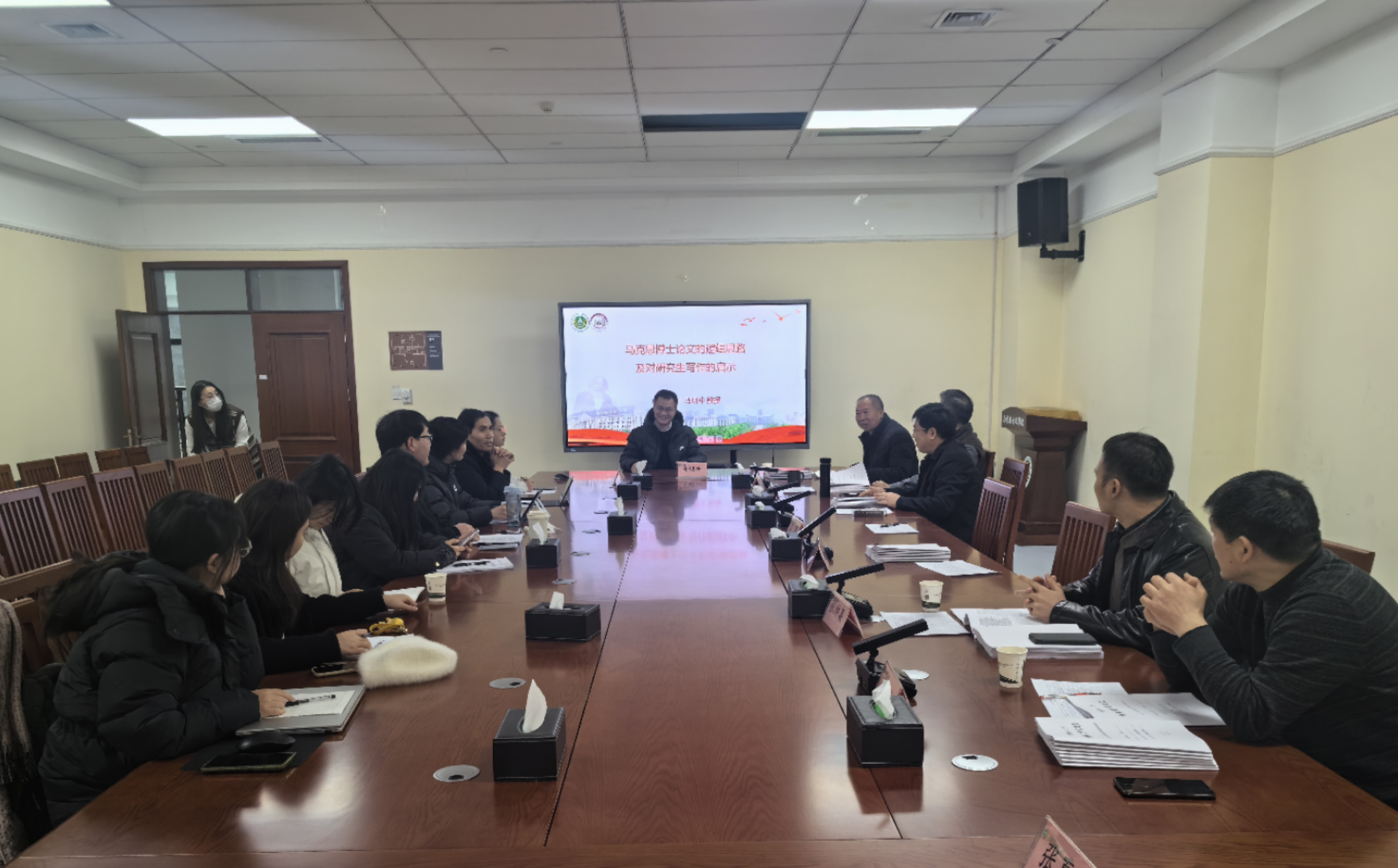 马鸣冲以《马克思博士论文的逻辑思路及对研究生写作的启示》为题,重点讲述了马克思博士论文的思路和方向。他指出,从马克思哲学思想发展整体逻辑进程看,博士论文对马克思的世界观转向具有重要的意义和价值。大学时期,马克思遭遇了旧哲学将“应有之物”与“现有之物”截然对立的难题,陷入了无法克服的“世界观危机”之中。在博士论文及其准备性材料《关于伊壁鸠鲁哲学的笔记》中,马克思对该难题进行了深入求解,确立了将“哲学的世界化”与“世界的哲学化”有机统一的哲学观。在此意义上,博士论文构成马克思世界观转向的逻辑开端。在对马克思博士论文的逻辑思路剖析的过程中,马明冲就研究生论文的写作问题与我院师生进行了深入交流,并提出了可行性建议。