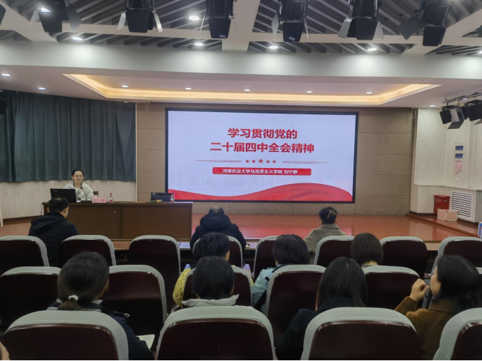 (通讯员:李国正)为深入学习领会党的二十届四中全会精神,使党的创新理论最新成果贯穿教育教学全过程,引导广大师生更好地用党的二十届四中全会精神武装头脑。12月9日,我院刘宁静副教授受邀到河南农业大学附属中学,以“学习贯彻党的二十届四中全会精神”为主题,围绕五个核心方面开展专题宣讲,为全体教师带来了一场兼具理论深度与实践温度的精神盛宴。宣讲活动在附属中学报告厅举行,由党总支书记李坤主持。