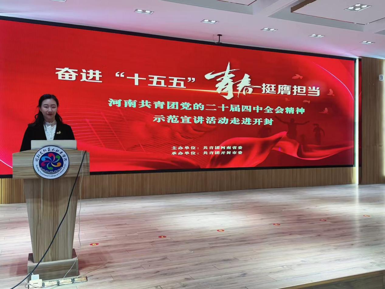 (通讯员:李国正)为深入学习贯彻党的二十届四中全会精神,引领青年发展,12月15日,我院团总支书记王海晶受邀参与河南共青团党的二十届四中全会精神示范宣讲活动。首场宣讲在开封文化职业技术学院进行。