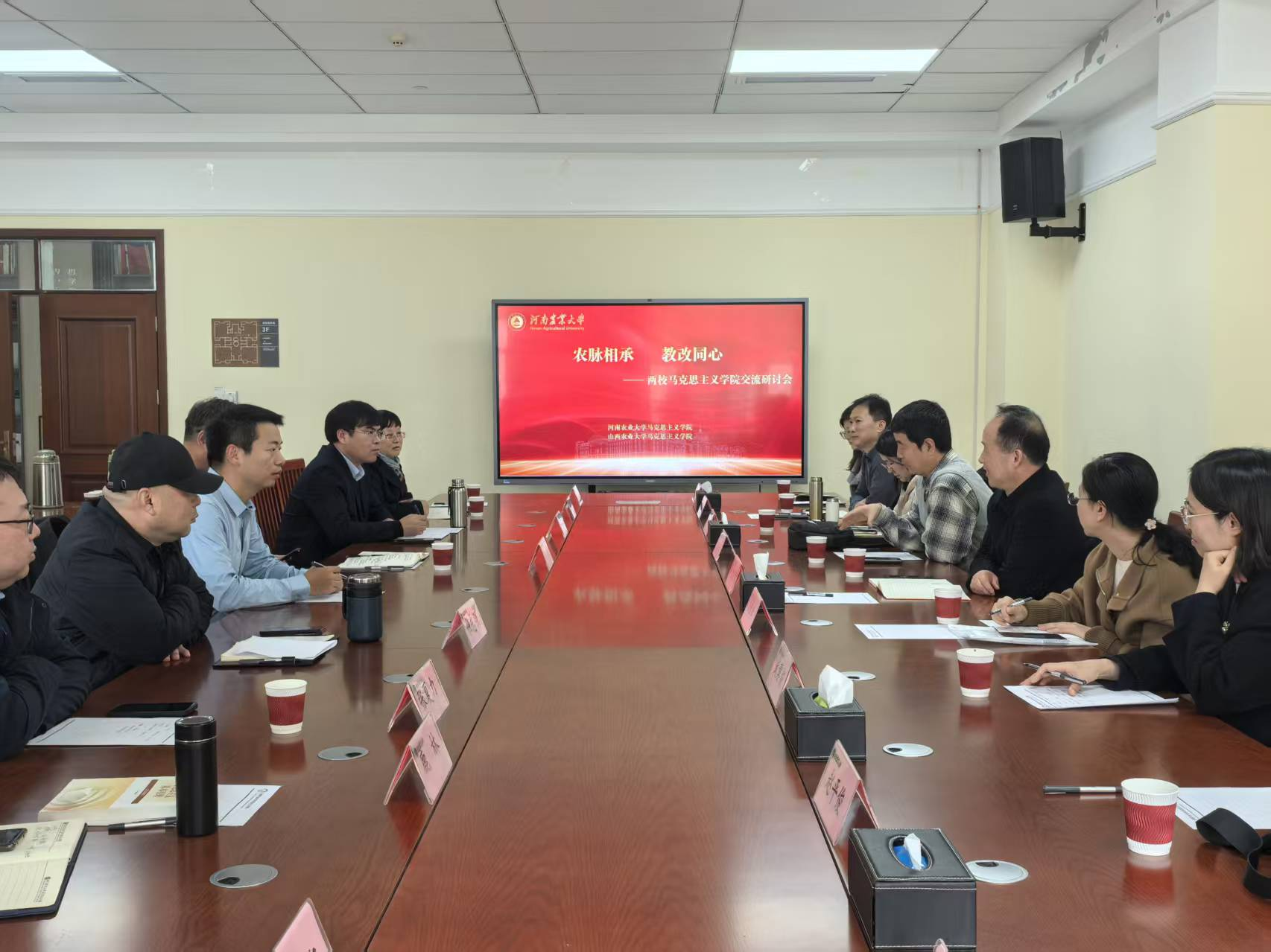 杜志强对山西农业大学一行的到来表示热烈欢迎,详细介绍了我校和我院的历史沿革、教学特色与亮点、学科建设、“马+农”思政品牌建设等情况。元纪明详细介绍了山西农大马院党建工作“1+3+3”的典型做法,通过党建与业务的深度融合,为他们各项工作高质量推进提供了坚强的组织保障。双方围绕国家级一流本科课程建设、课堂教学、实践教学、名师工作室建设等方面进行了深入的交流,并分享了具体的经验和做法。周红飞表达了对双方未来合作的期待,希望在人才培养、课程共建、科研协同等方面优势互补,实现共赢。